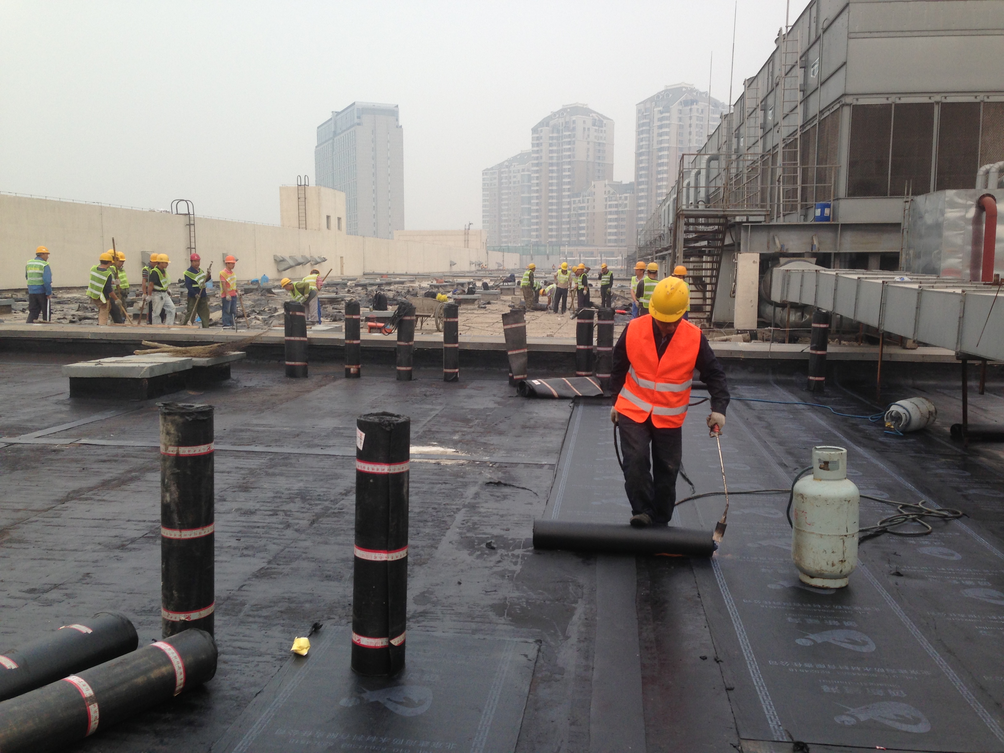 (3)采用热熔型改性沥青胶结料铺贴卷材时,应随刮随滚铺,并应展平压实。