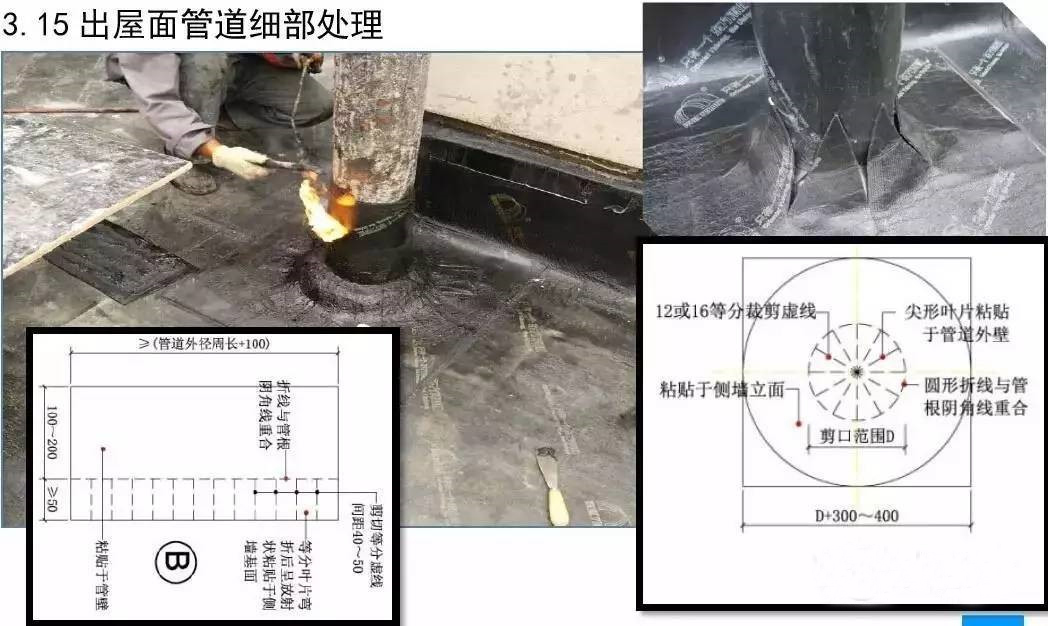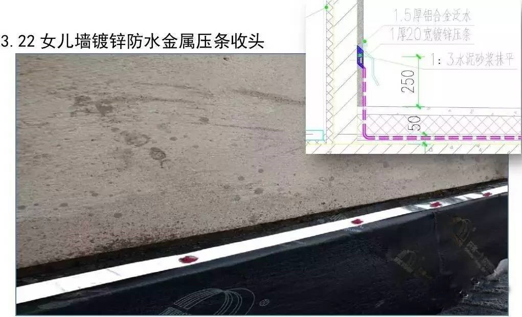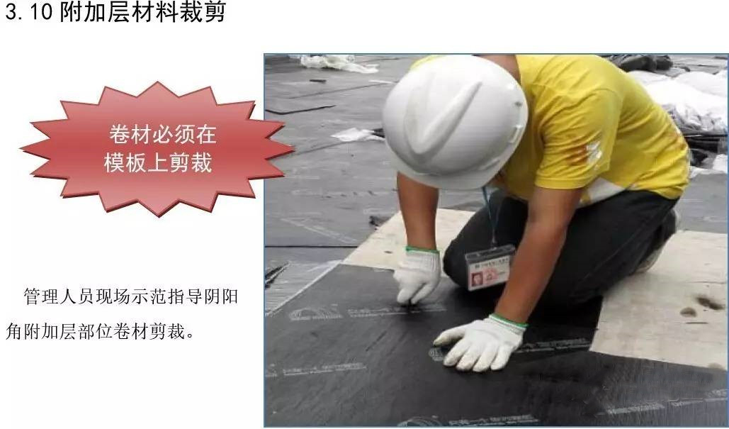 屋面防水工程为3厚SBS自粘聚合物改性沥青聚酯胎体防水卷材两道;40厚C20细石混凝土保护层内配Φ6@150双向钢筋。根据现场实际施工进度情况,确定3#楼屋面防水工程作为样板展示区,其它楼号参照3#楼屋面执行施工。