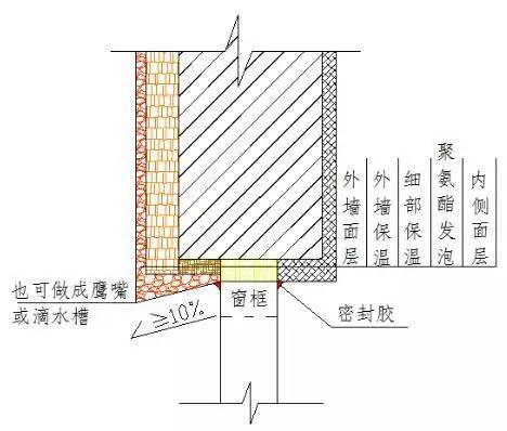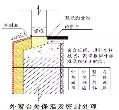 1、充分考虑室外保温的厚度和室内窗台面层的做法,将窗台压顶做成内高外低;