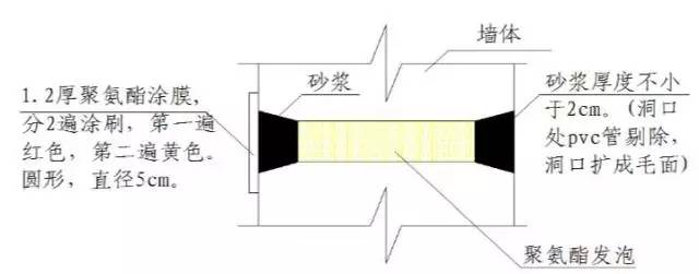3、外侧封堵部位涂刷聚氨酯涂膜,厚度不低于1.2mm,要求多遍涂刷,为方便检查,保证厚度,相邻两遍采用不同颜色进行,可采用红黄色交替进行;