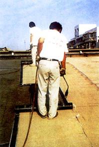热溶法一般在涂刷基层处理剂8h后进行,火焰加热器的喷嘴距卷材面的距离约0.5m左右,与基层呈45~600角。